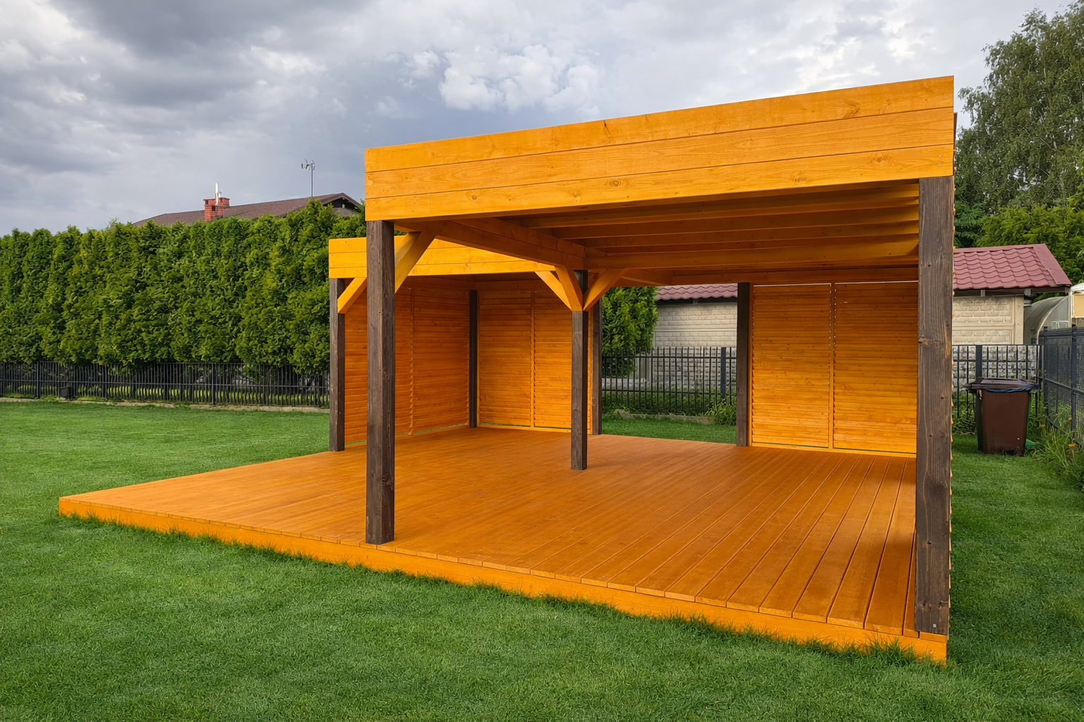 Podłoga drewnianaJest opcją dodatkową cena jest wyliczana z obrysu altany, jeśli chcesz żeby wystawała po za nią bądź był zrobiony taras trzeba uwzględnić to w polu UWAGI.